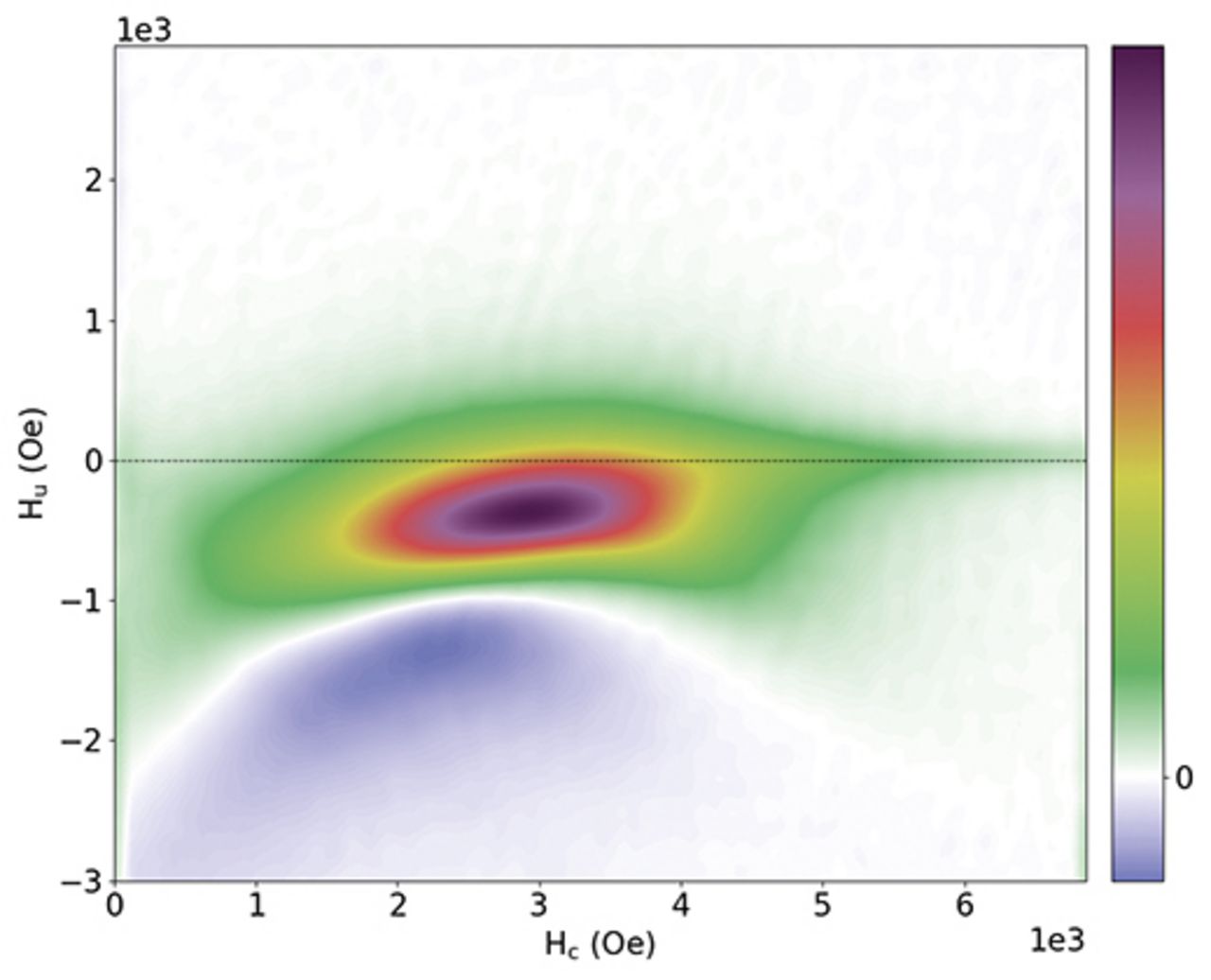 - Durch eine Koordinatentransformation entsteht das FORC-Diagramm. Es werden mit Hc und Hu zwei neue Parameter \(H_{ c }=\frac{H_{ b }-H_{ a }}{2}\) und \(H_{ u }=\frac{H_{ b }+H_{ a }}{2}\) definiert: Hc beinhaltet Informationen zu den Koerzitivfeldern und Hu zu den Wechselwirkungsfeldern. Das FORC-Diagramm ist die gemischte zweite Ableitung („Krümmung“ der Kurve)