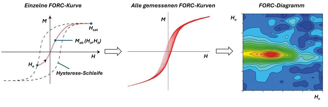 Abb. 1 zeigt schematisch das Zustandekommen des FORC-Diagramms aus den einzelnen Messkurven. Ein FORC-Diagramm liefert nicht nur Informationen über die Verteilung von Wechselwirkungs- und Umschaltfeldern, sondern dient auch als eine Art „Fingerabdruck“, der Einblicke in den Domänenzustand und die Art der magnetischen Wechselwirkungen in einem Material gibt. In einem FORC-Diagramm stehen vollständig geschlossene Konturen typischerweise für ein Single-Domain-Verhalten. Offene Konturen, die sich in Richtung der Hu-Achse ausbreiten, deuten auf ein Multi-Domain-Verhalten hin. Eine Kombination aus offenen und geschlossenen Konturen weist auf ein Pseudo-Single-Domain-Verhalten hin.