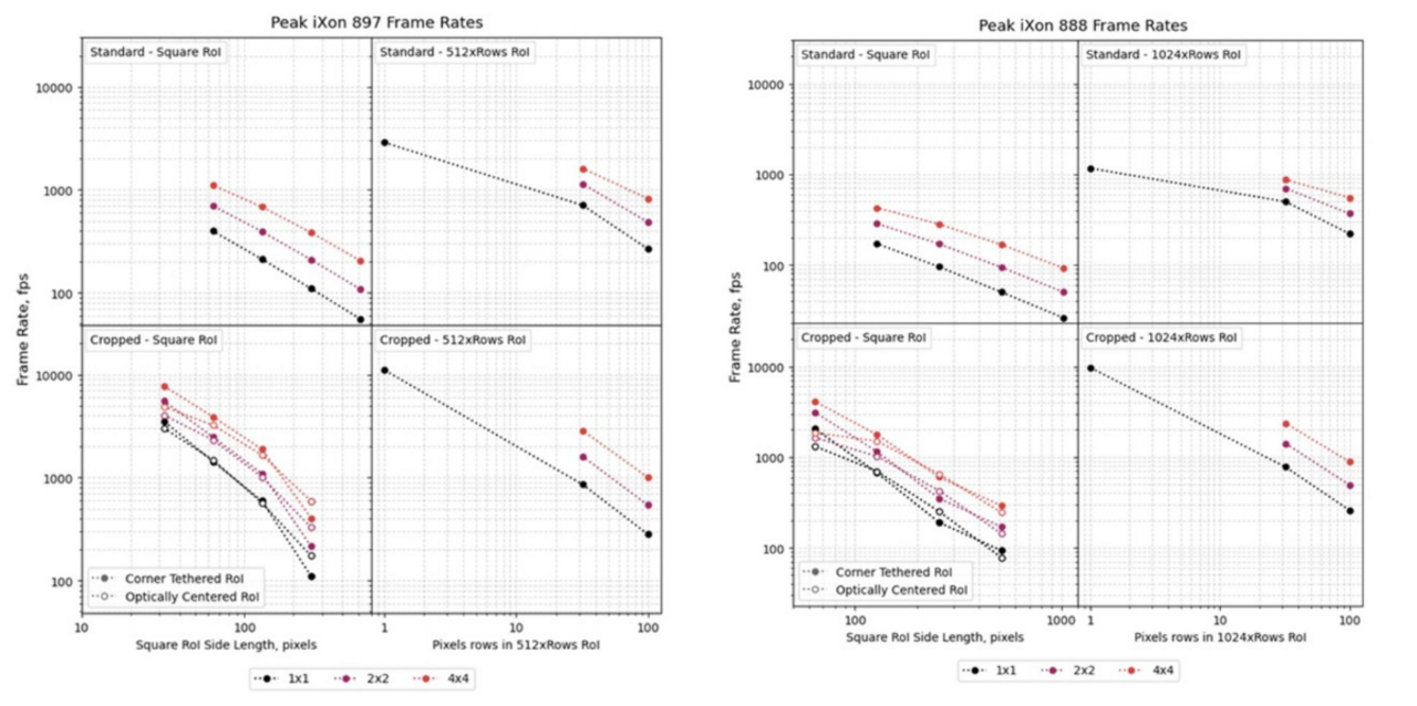 Questo articolo fornisce una guida grafica e un riepilogo di come le differenti modalità di funzionamento delle camere CCD (Charge Coupled Device) e EMCCD (Electron-Multiplied Charge Coupled Device) di Andor influenzino sia il massimo frame rate raggiungibile che la latenza di lettura ed il trasferimento dei dati. Vengono presentati i grafici che mostrano i frame rate di picco ottenuti da ciascuna camera in diverse condizioni operative e, dai dati ottenuti, identificate le tendenze generali che chiariscono come le prestazioni di una camera sono influenzate dal modo in cui viene utilizzata.