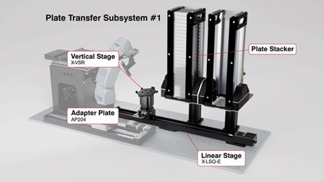 Per trasferire e scansionare automaticamente 25 micropiastre senza alcun intervento umano, Zaber ha progettato un sistema che integra due impilatori di piastre e due sottosistemi di trasferimento delle piastre stesse.