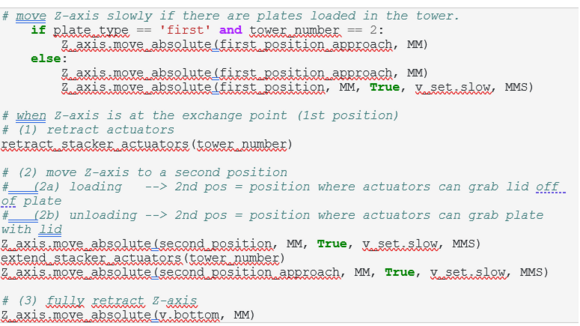 L'API Zaber Motion Library è ampiamente documentata e supportata da una libreria di utili codici di esempio, oltre a includere una guida introduttiva facile da seguire. Per la programmazione del braccio robotico è stata utilizzata la API Python Mecademic, che ha permesso il perfetto coordinamento dei dispositivi Zaber e Mecademic attraverso l’utilizzo dello stesso codice. Il workflow è stato implementato per velocizzare il sistema, consentendo la scansione di una piastra sul microscopio mentre la successiva viene prelevata dal carrello porta-piastre. Il codice Python scritto per questo sistema demo è disponibile di seguito.