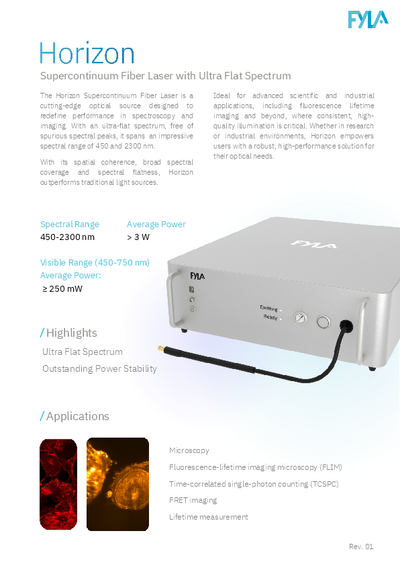 Horizon from FylaThe Horizon Supercontinuum Fiber Laser is a cutting-edge optical source designed to redefine performance in spectroscopy and imaging. With an ultra-flat spectrum, free of spurious spectral peaks, it spans an impressive spectral range of 450 and 2300 nm.